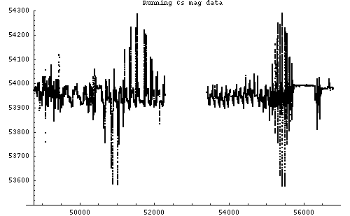 The lost data can be seen in a plot of the time tags versus datum number; this is shown in Figure 7. Also, the gap in data is apparent in the plot of the magnetometer data value versus time as seen in Figure 8; also apparent is the change in direction -- N-S tracks versus E-W tracks.