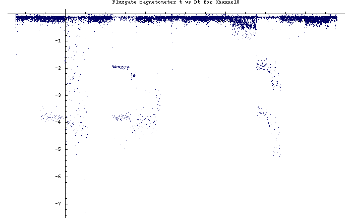 I don't understand why, but the fluxgate magnetometer data also occationally was missing. It wasn't completely random, there were times when all the data was polled and came in at 0.1 Hz, but sometimes the logger would either suspend polling, or would poll and get no response (in which case it would wait for 100 mS before trying again). In any event, there are times in the survey when lots of data went missing as the effective polling rate when way down. The longest wait was 7 seconds. A scatter plot of the time vs the derivative of the time shows this well, see Figure