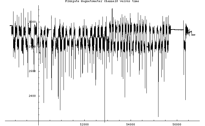 Just for kicks, I plotted each fluxgate magnetometer versus time. Figure 13, 14, and 15 show these plots for magentometer 0, 1, and 2 respectively. (Please ignore the title on the plot, they are incorrect.) The range is 8 bits, so we were not taking advantage of much of the dynamic range available.