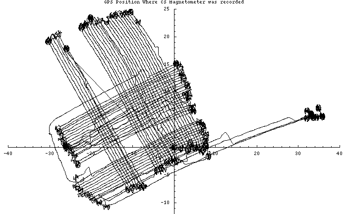Interpolation was done on the GPS data's time tags and the time tags provided for each magnetometer datum to arrive at a positon on the survey grid. In addition, as this magnetometer was mounted on the front of the cart, a correction was made in the position to reflect the position not of the GPS unit, rather the magnetometer itself. Furthermore, when the data from the GPS was missing, the position of the magetometer is uncertain; such data was removed.