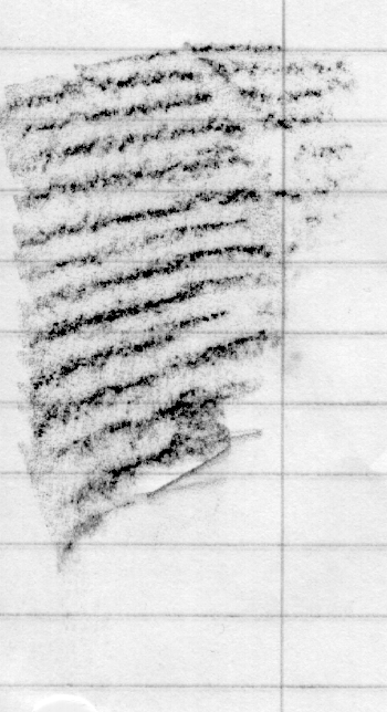Figure 01c: Tree rings from a plank that is solid on once side (facing camera) and rotted or burned out on the inside. The plank is about 120 cm (L) x 10 cm (W) x 30 cm (D) and is slightly curved along its long length.