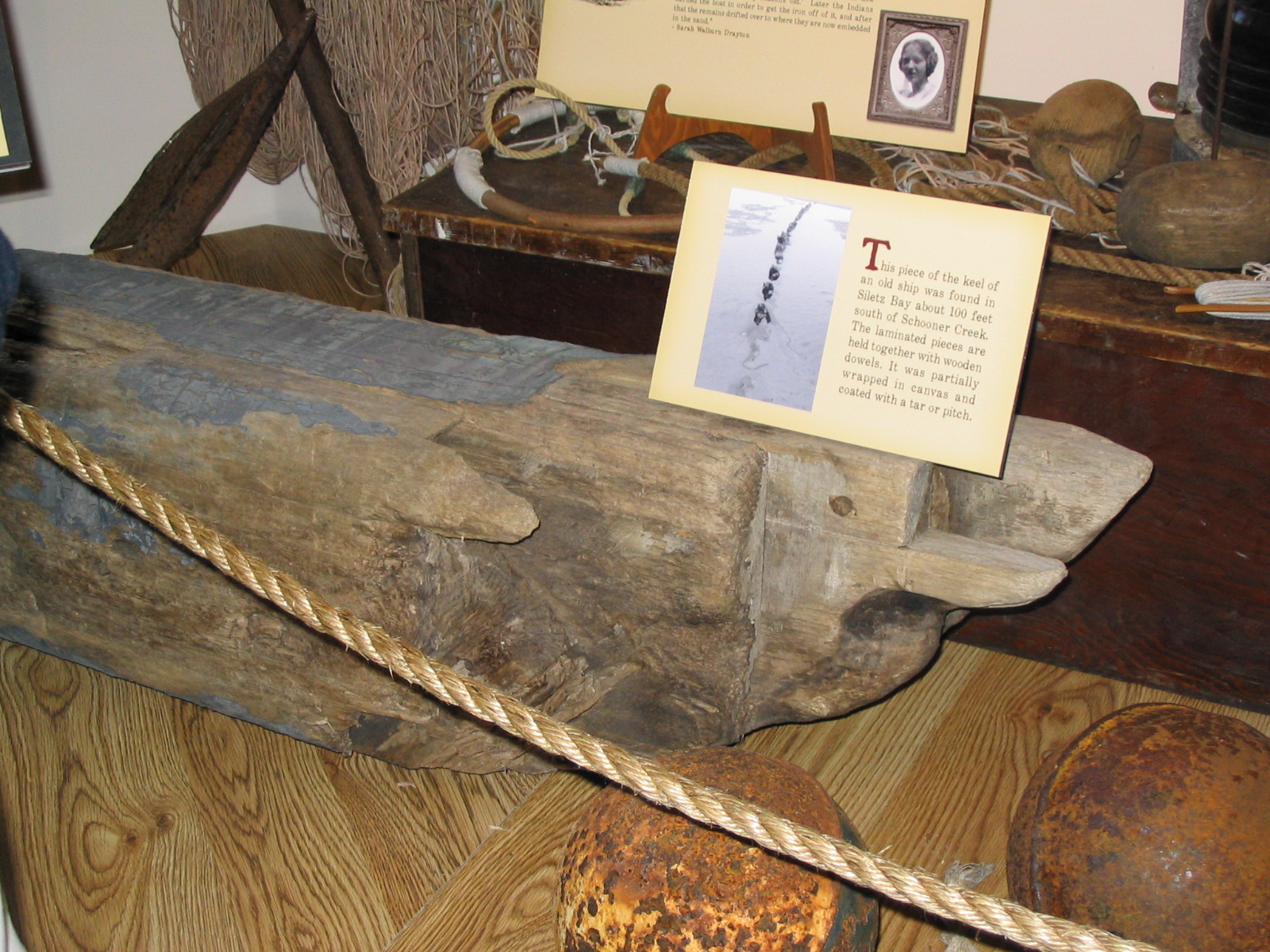 Figure 02: It has been suggested that this fragment is a section of keel (so says the sign at the museum). However, this is unlikely as the fragment is parcelled. This fragment is about 1 meter long, 0.3 m wide, 0.4 m high (orientated as shown). The top show a blackish-grey deposit which is suspected to be parceling -- tar soaked canvas steched tightly around the wood. Note the area on the right side (near the centre of the image) has a cutout for a brace (?) coming out at the 45 degree angle. Also note the extreme wear due to wave action.